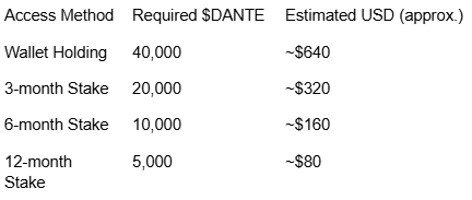 Eligibility: To enter, players must hold or stake a qualifying amount of $DANTE at snapshot time. Snapshots will be taken Aug 5 at 00:00 UTC.