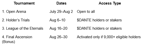 3. League of the Eternals: Aug 16–20 — $DANTE holders or stakers